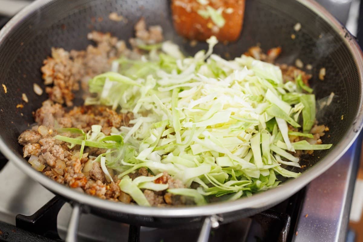 When pork is fully cooked and mixed with seasonings, add in the shredded cabbage.