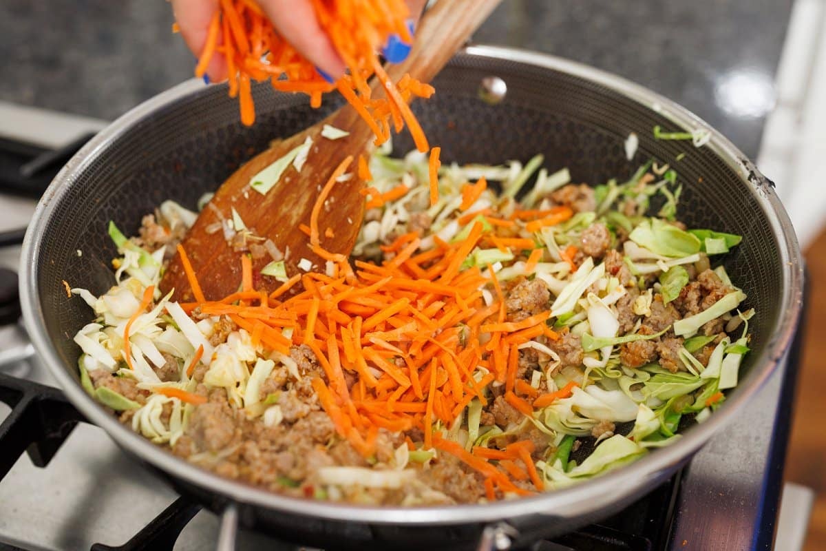3. Add grated cabbage and carrots to the mixture, along with soy sauce and rice vinegar. Cook an additional 3 minutes. Remove from heat and allow the mixture to cook slightly for about 10 minutes.