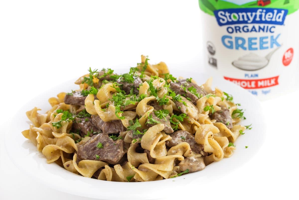 Recently I partnered with my good friends at Stonyfield Organic to create a protein-packed Beef Stroganoff made with their creamy, full-fat whole milk Greek yogurt. Traditionally made with sour cream, I prefer using Stonyfield Organic Greek yogurt which contains more protein and fewer calories. Yogurt is one of those highly versatile products that I love to keep on hand for all sorts of surprising and unexpecting recipes such as this one.