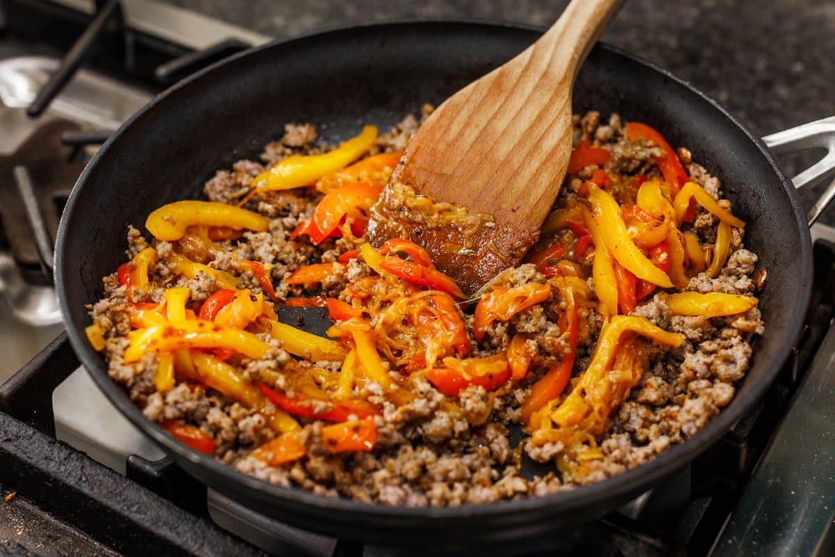 In the same pan, add your breakfast sausage and crumble while it browns. Once fully cooked, add the onion and peppers back in.