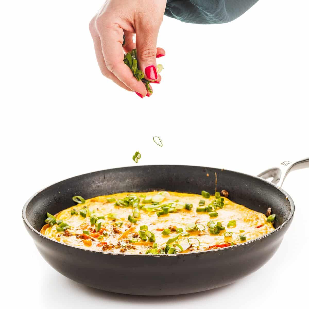 - Pour egg mixture on top of the sausage and veggies in the skillet and stir two or three times to incorporate. Sprinkle cheddar cheese on top then bake in the oven until eggs are cooked through and fully set, about 12-14 minutes.