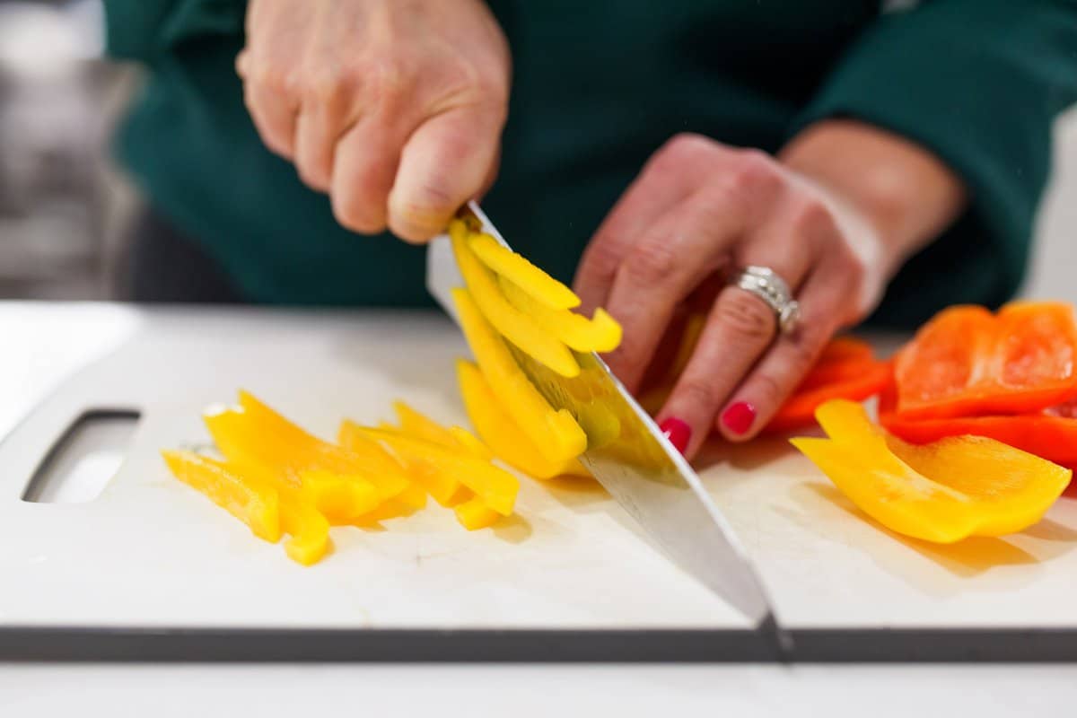 Start your easy breakfast frittata by thinly slicing your onion and bell peppers, if you didn’t buy them pre-sliced.
