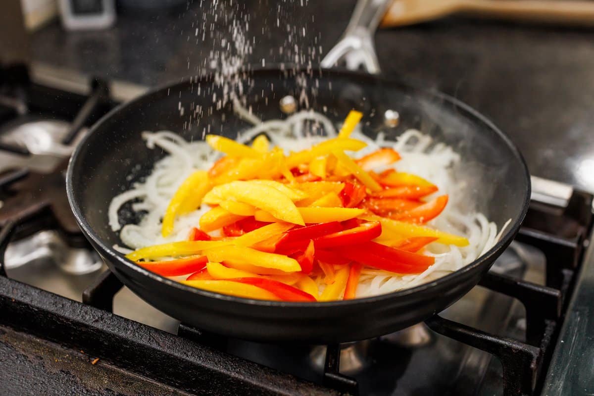 Add your slices of onion and bell pepper to the hot pan.