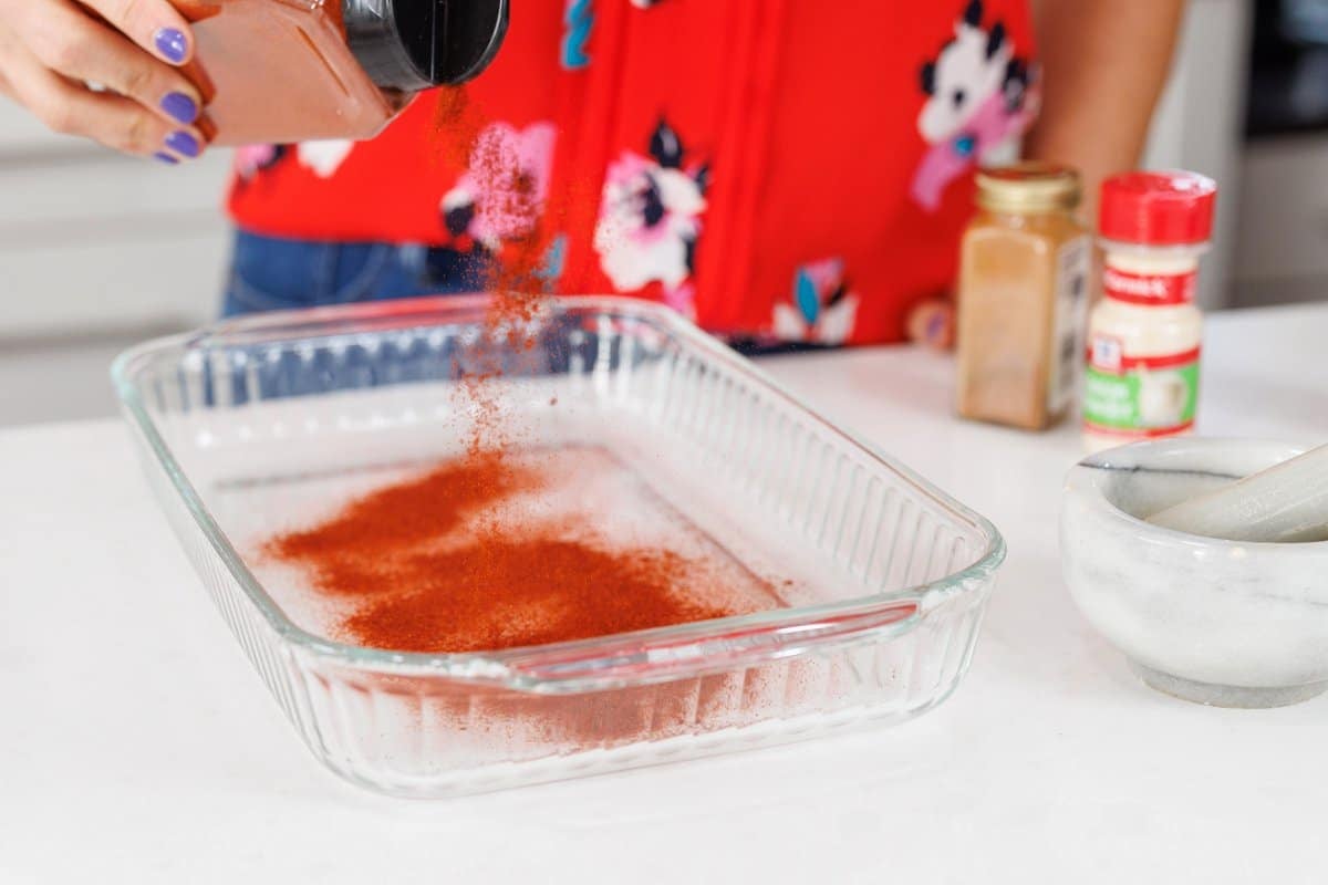 2. In a long baking dish, mix together all of the spices with a fork until evenly blender. Pat the pork tenderloin dry with paper towel then place in the baking dish. Using your hands, coat the pork tenderloin on all sides evenly with the spice mixture.