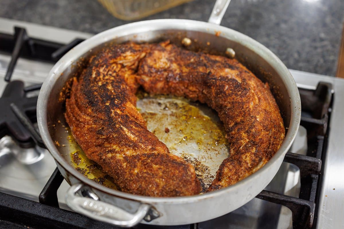 Add the tenderloin and sear, using tongs to rotate until it’s seared on all sides, about 1-2 minutes. Searing the tenderloin helps to lock in the moisture before you finish cooking in the oven.