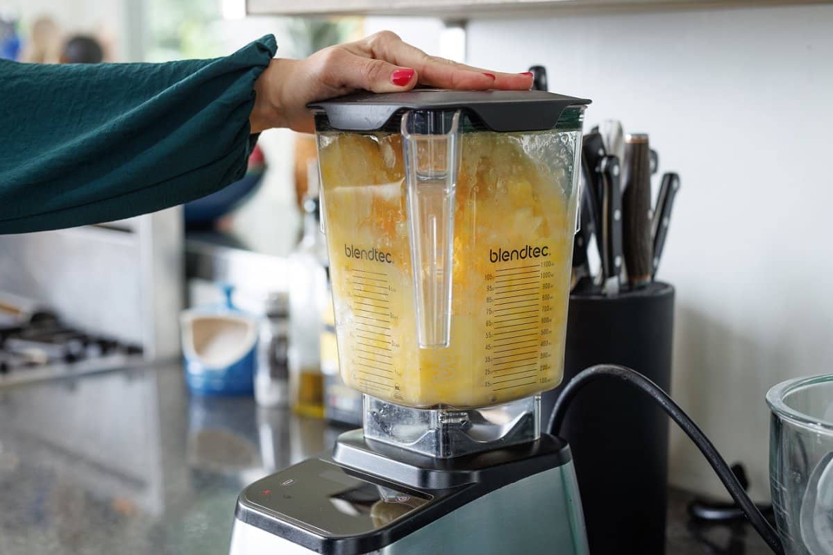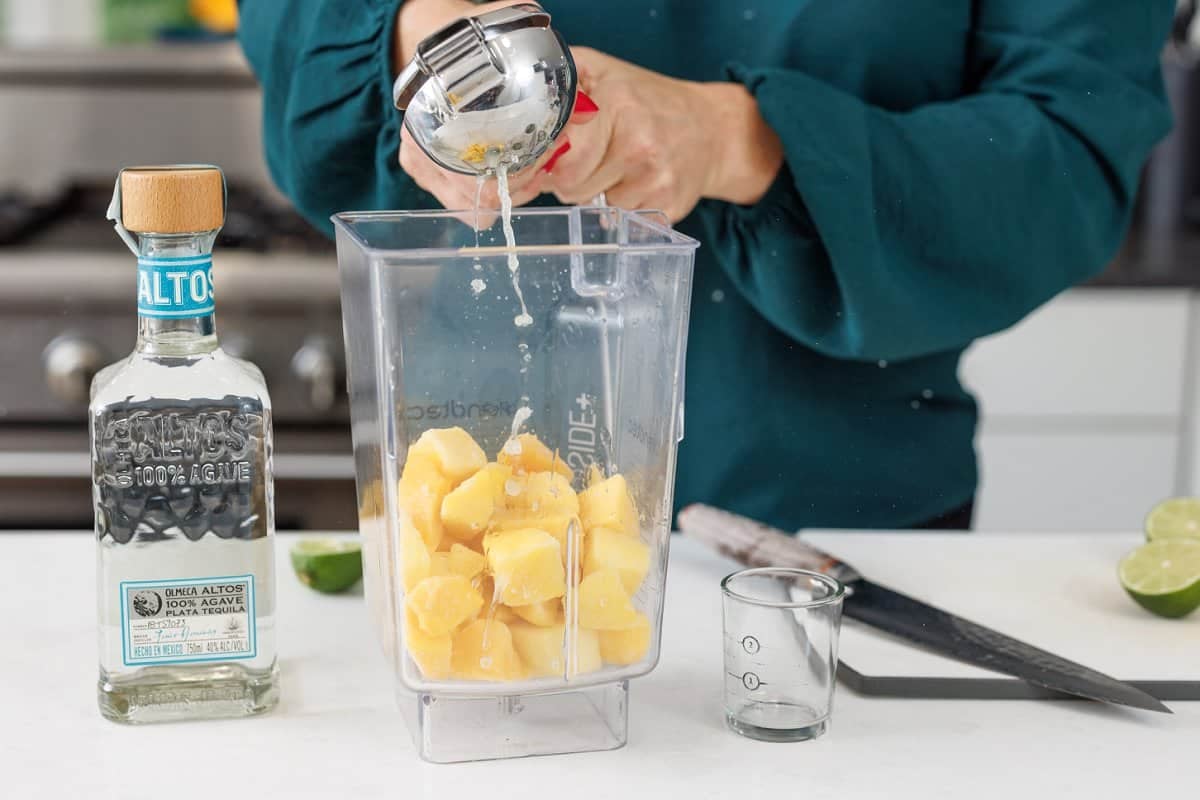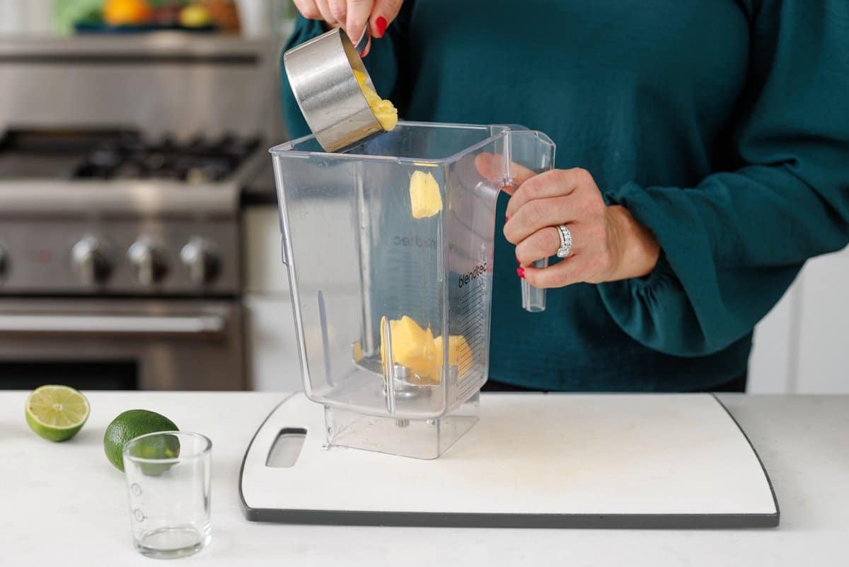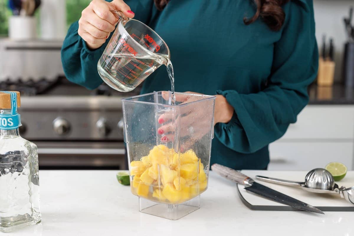 While the simple syrup cools, grab your mango chunks and add it to your blender.