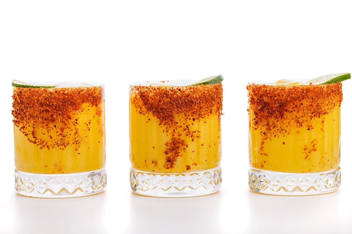 1. Dip the rim of each glass in water or rub a lime wedge around the edge to moisten. Pour chili lime salt into a small plate and dip each glass to line rim; set aside.