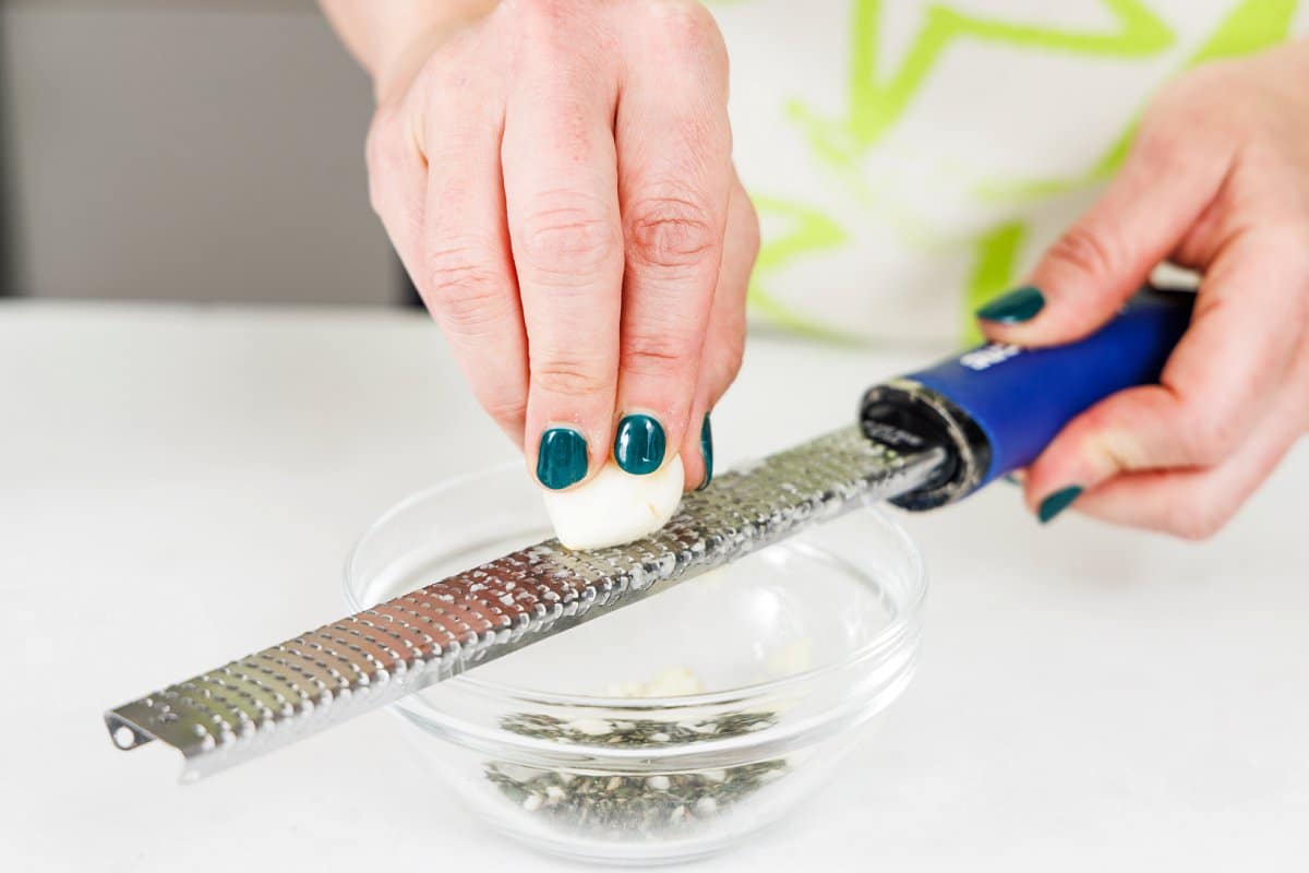 Step 2. Next use a microplane to grate your garlic into the bowl, and add salt and pepper. Stir together.