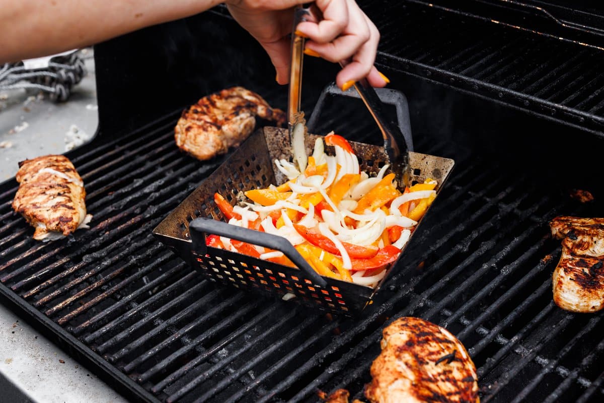 4. Grill vegetables in a grilling basket until tender and caramelized, tossing frequently, about 9-11 minutes. Serve with grilled chicken.