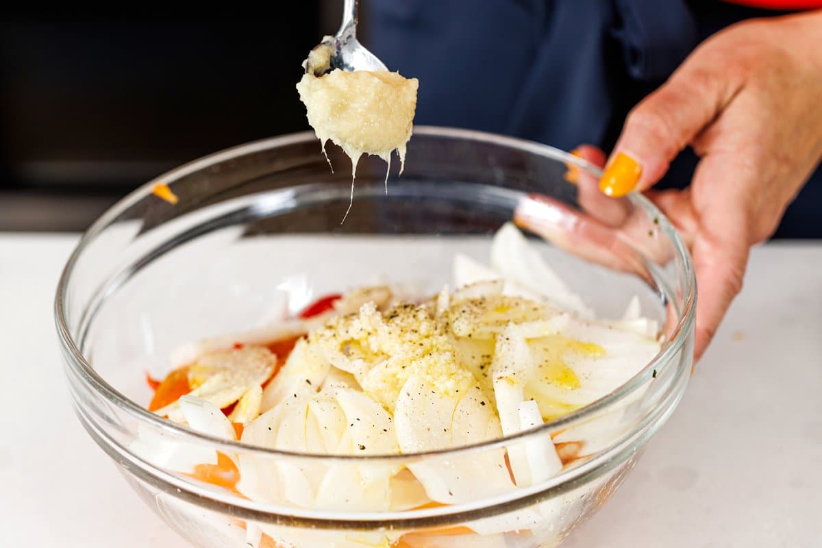 Then in a bowl, toss the veggies in olive oil, garlic, ginger, and some salt and pepper.