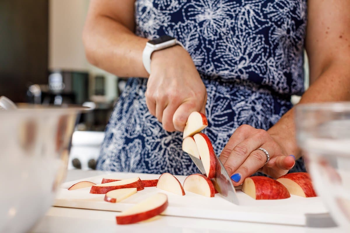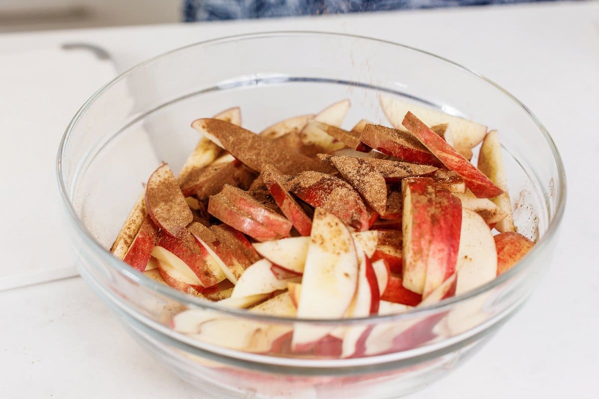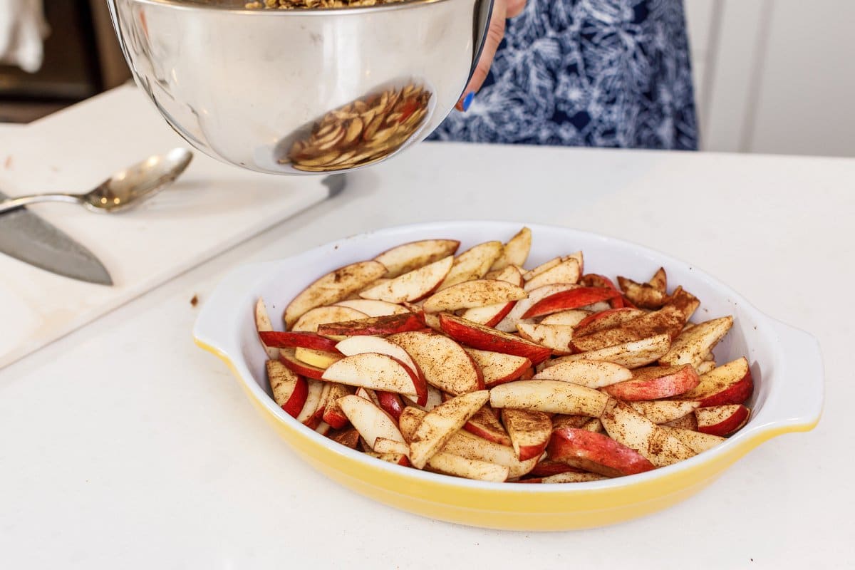 While optional, I love to toss the sliced apples with cinnamon before placing them in the bottom of the baking dish. My recipe is lightly sweetened with maple syrup but if you prefer a sweeter crisp, feel free to sprinkle the apples with 1/2 cup brown sugar.