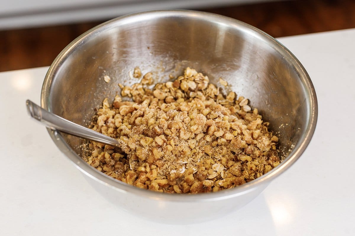 For the rest of the topping, I mix gluten free oats with chopped walnuts, maple syrup, olive oil and warm spices. If you prefer pecans, go ahead and swap those!
