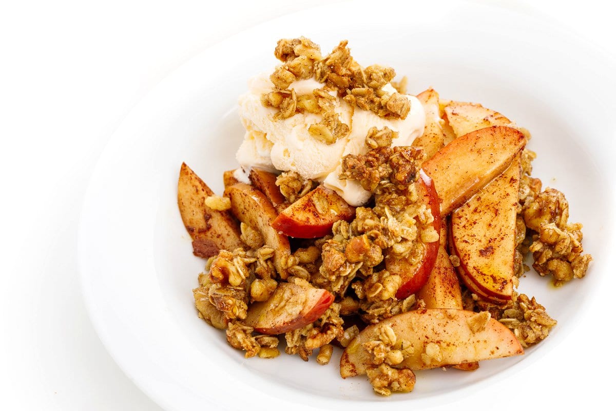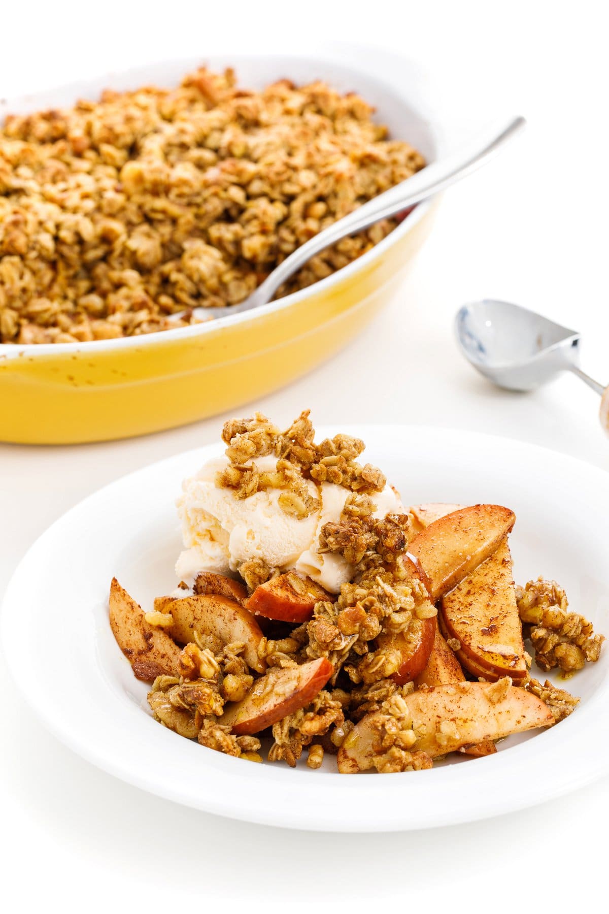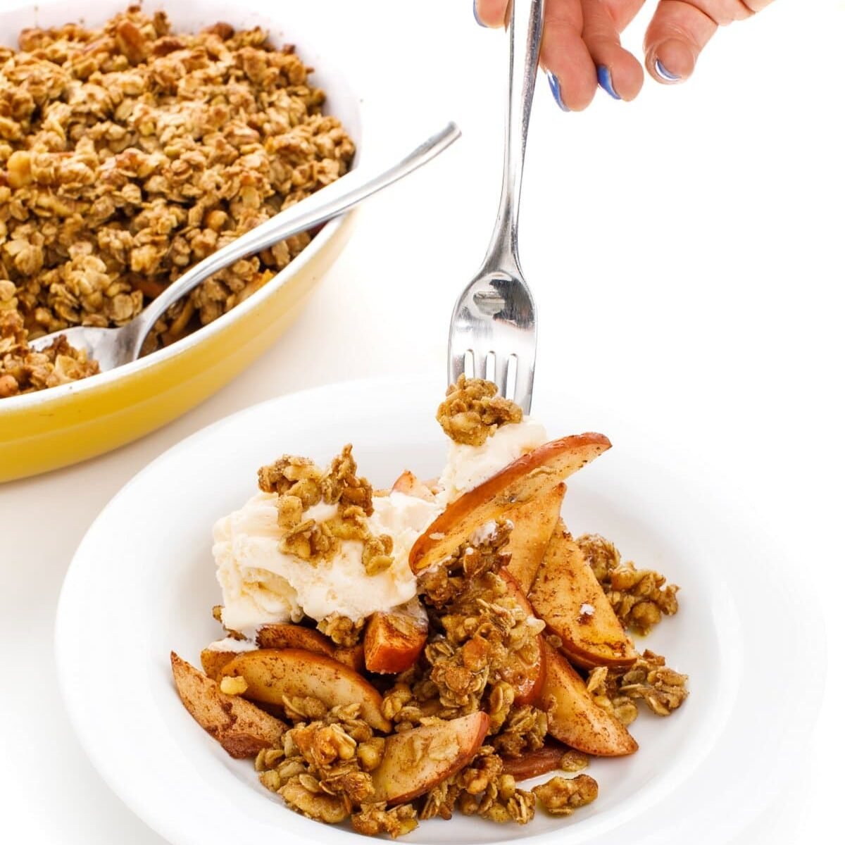 4. Bake until oat topping is golden brown and apples are warm and bubbly, about 45 minutes. Serve with a scoop of vanilla ice cream if you wish.