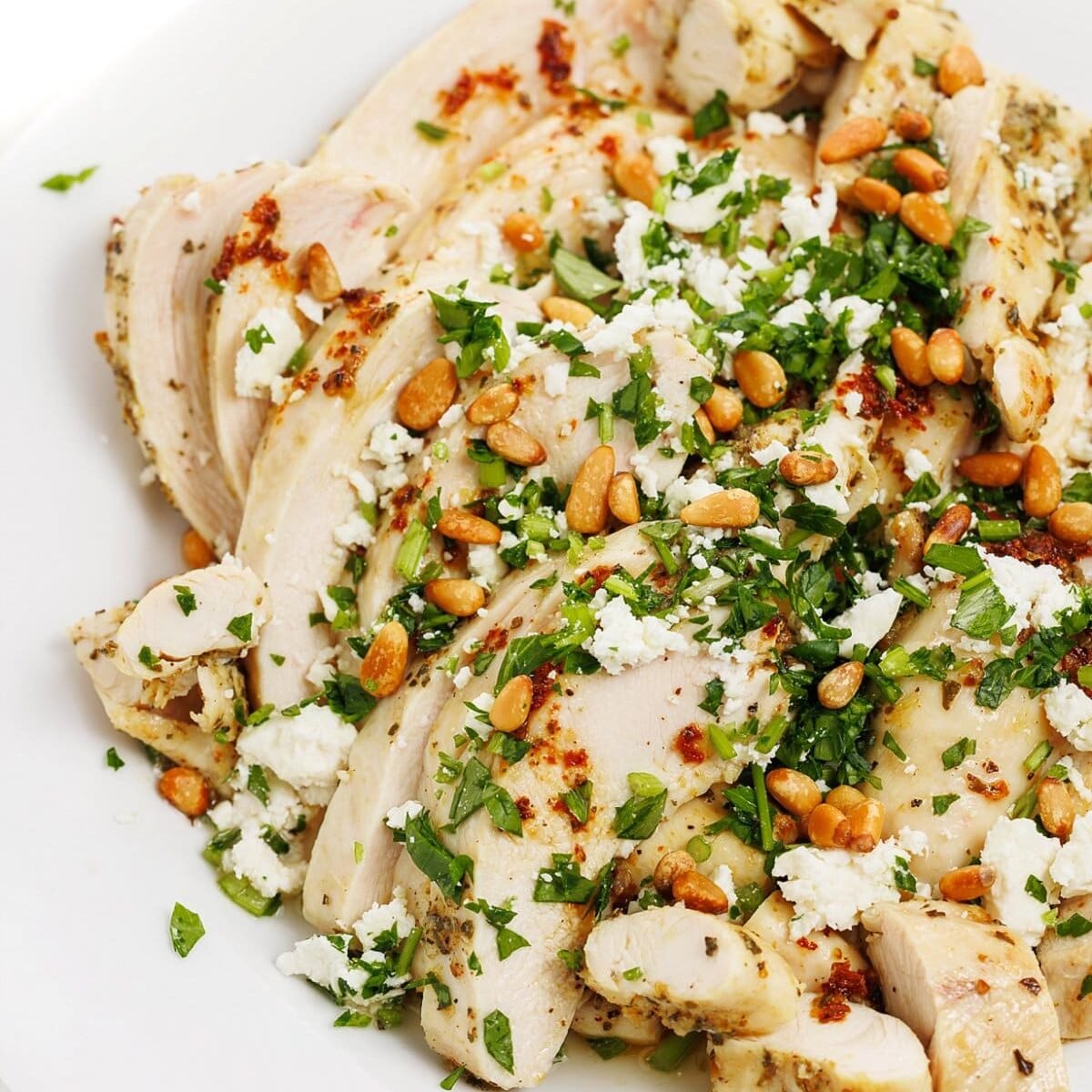 Moist chicken seasoned with delicious Greek flavors such as garlic, lemon, coriander, and oregano, and garnished with fresh herbs.
