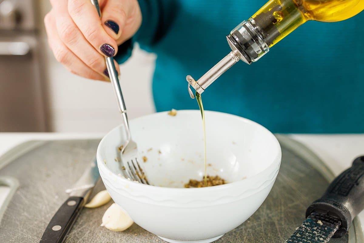 Start your Greek Style Baked Chicken Breasts by making your spice mixture. Freshly grate some garlic into a small bowl.