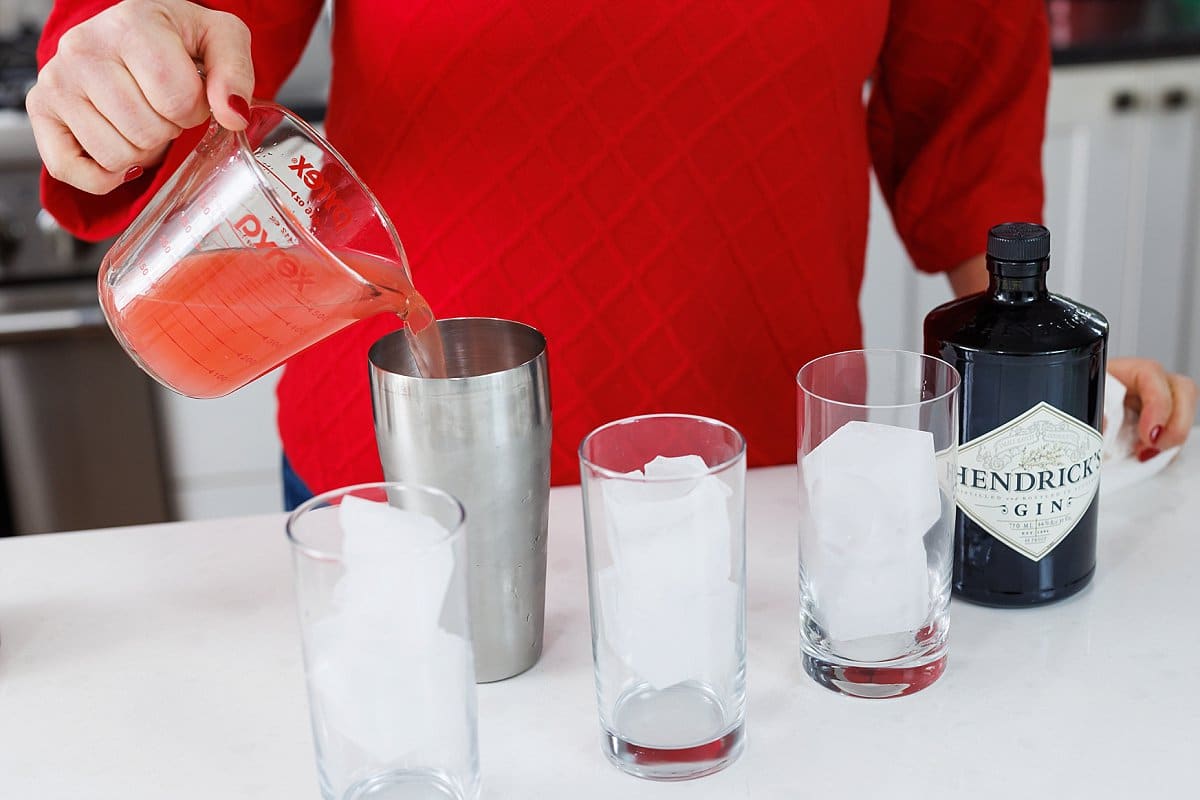 Follow with your gin or vodka, then shake until chilled and combined. Pour into glasses filled with ice! If you don’t have a cocktail shaker, you can also make the cocktail in individual glasses and just stir to combine.