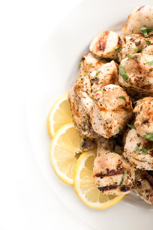 This easy Grilled Chicken Souvlaki recipe is made with a Greek-inspired marinade made with lemon juice, garlic and olive oil. An easy chicken dinner recipe, it’s delicious wrapped in pita bread, served with Greek salad or over rice pilaf. This high protein dinner recipe is also ideal for prepping ahead.