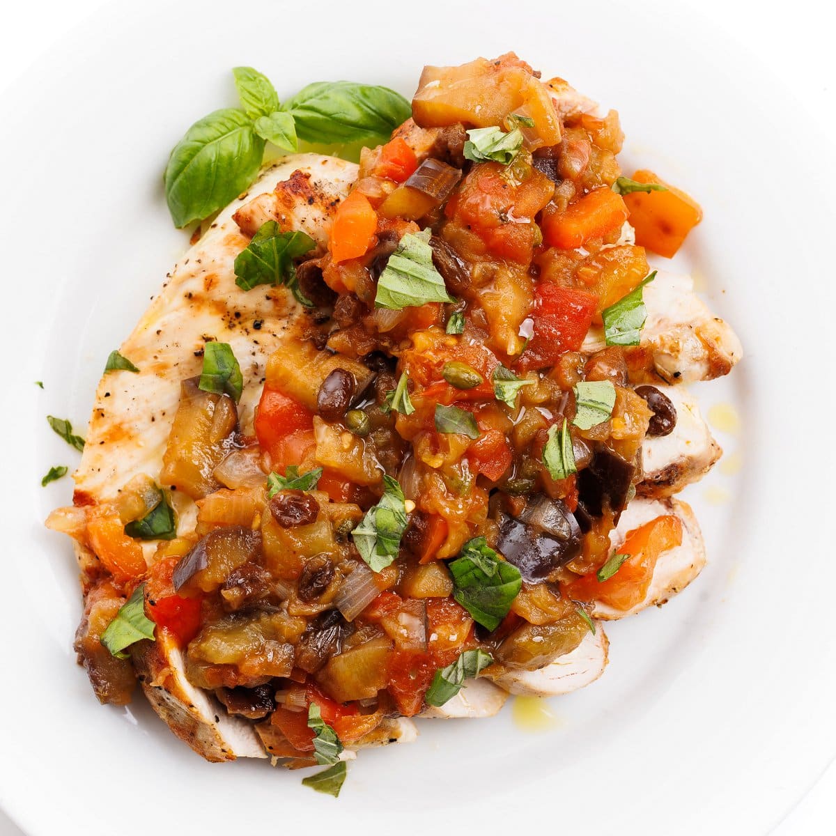 Serve the grilled chicken topped with the eggplant caponata and fresh basil or parsley. Enjoy!