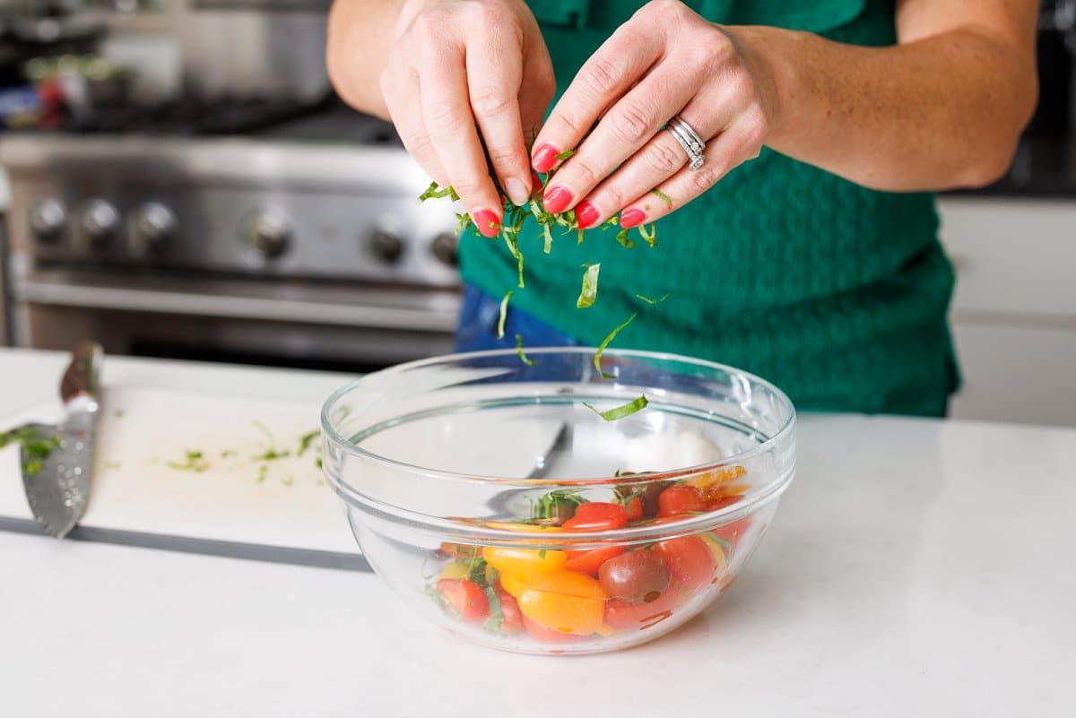 Then take your fresh basil leaves that you’ve finely chopped to the bowl with the tomatoes.