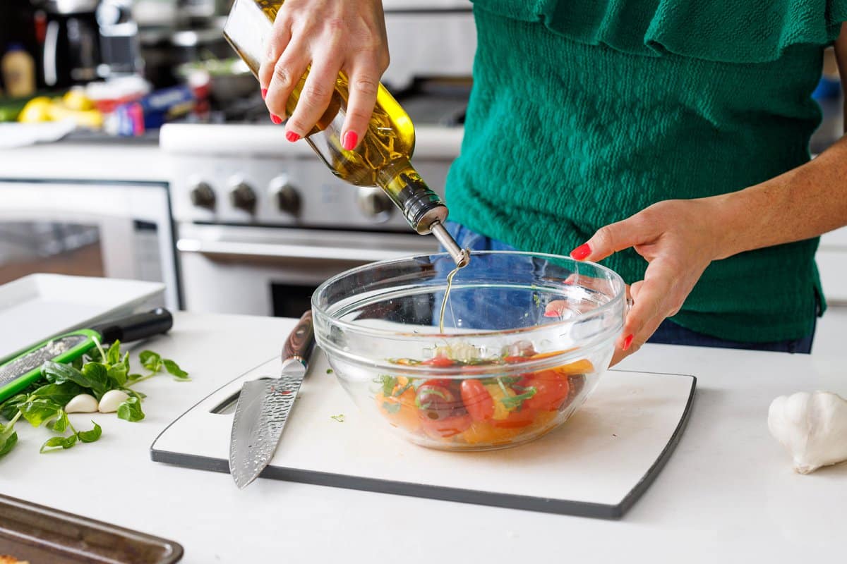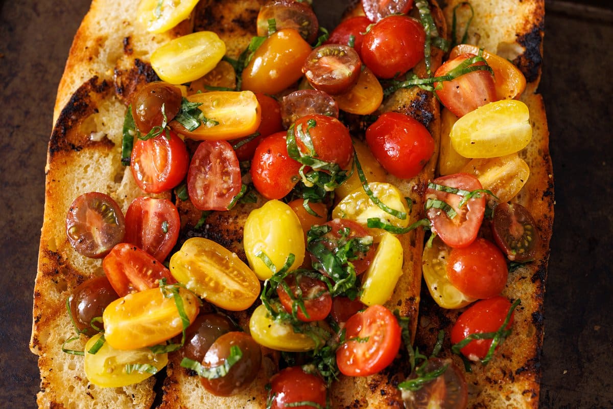 • Olive oil: Dresses the tomato topping and helps to slightly soften the bread slices to make it easier to chew.