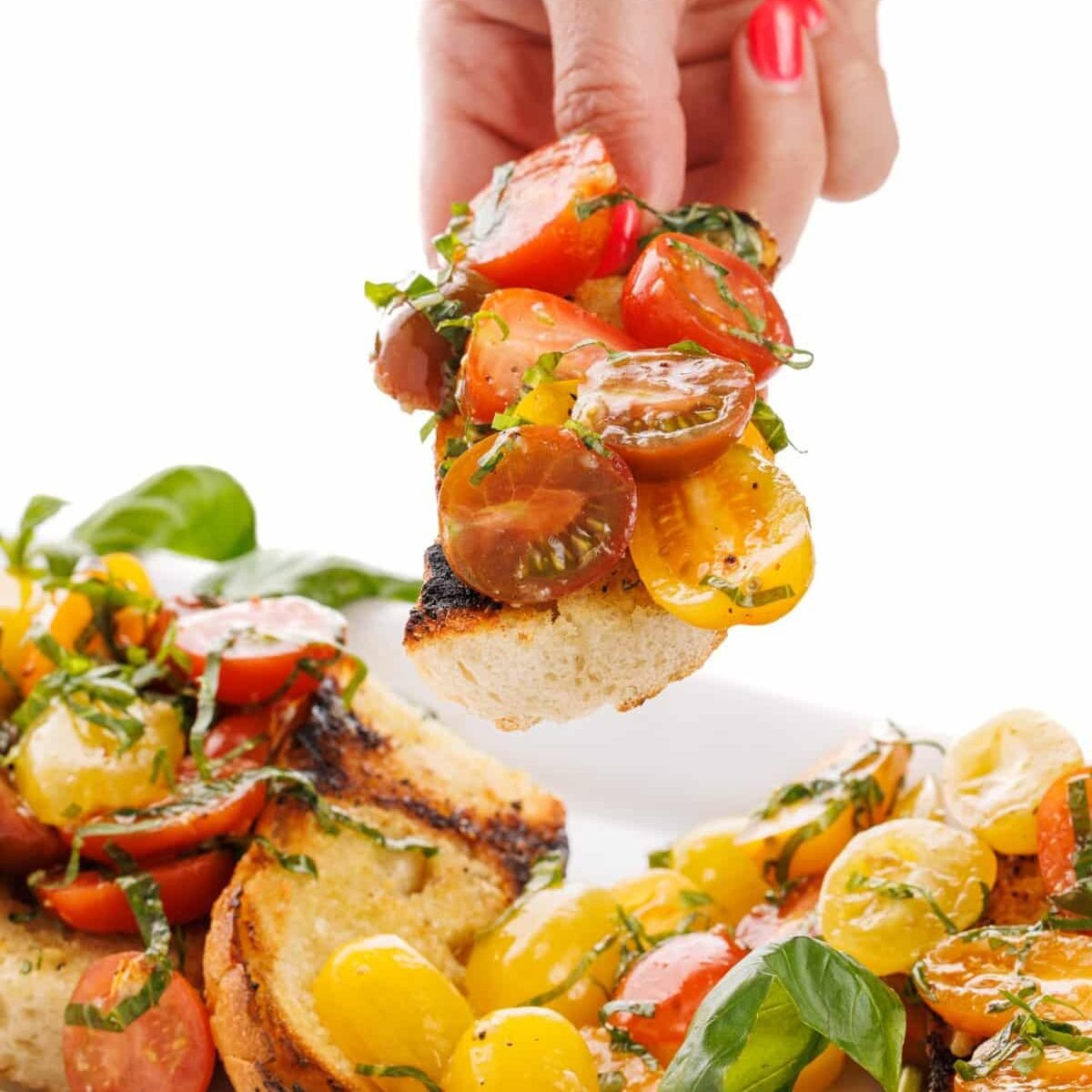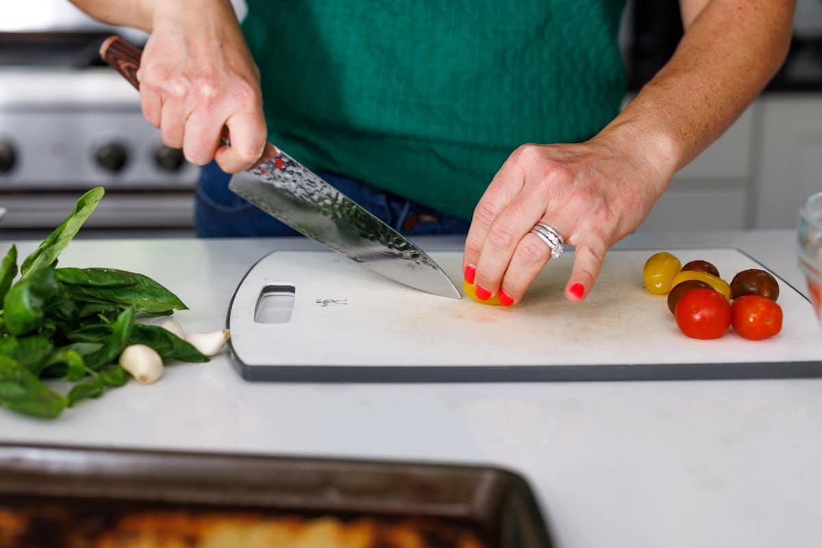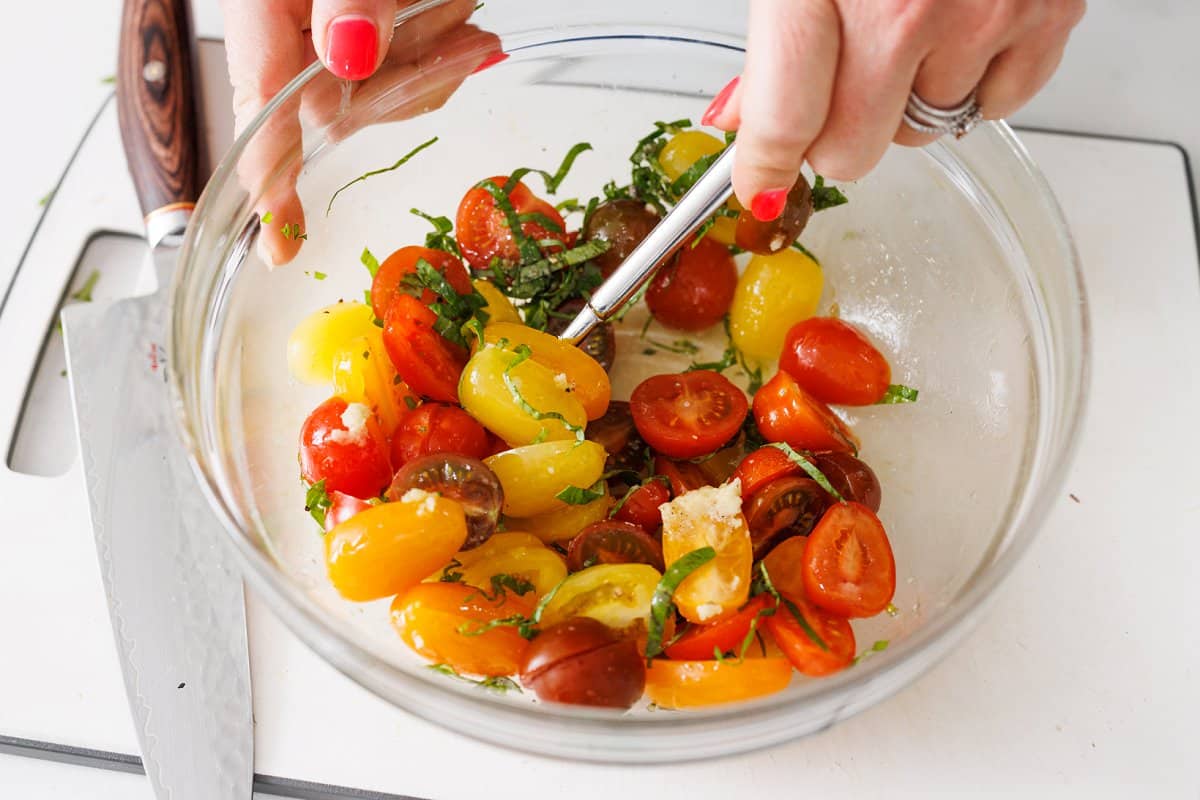 • Cherry tomatoes: The star of the topping and small bites of juicy, sweet goodness. You could also use diced Roma tomatoes or halved grape tomatoes.