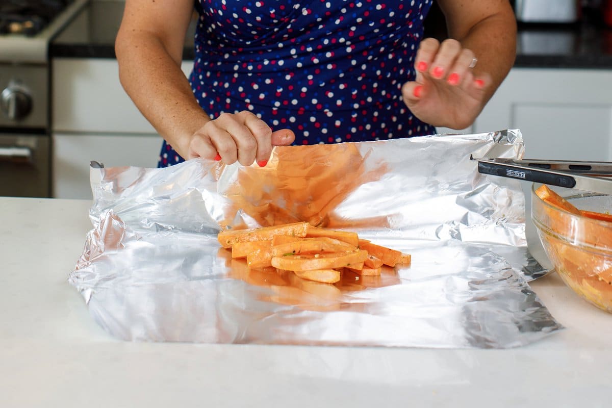 Now it’s time to make the foil packets! Simply place the potatoes in the middle of the foil then fold the foil to create little packets to toss on the grill.