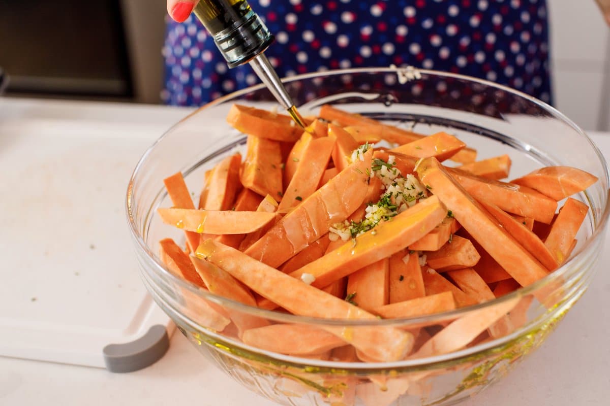 2. In a large bowl, toss together all ingredients until sweet potatoes are evenly coated with oil and spices.