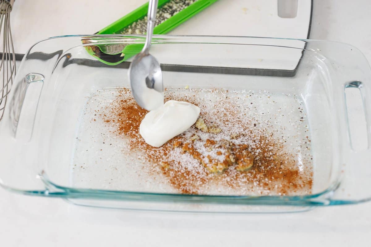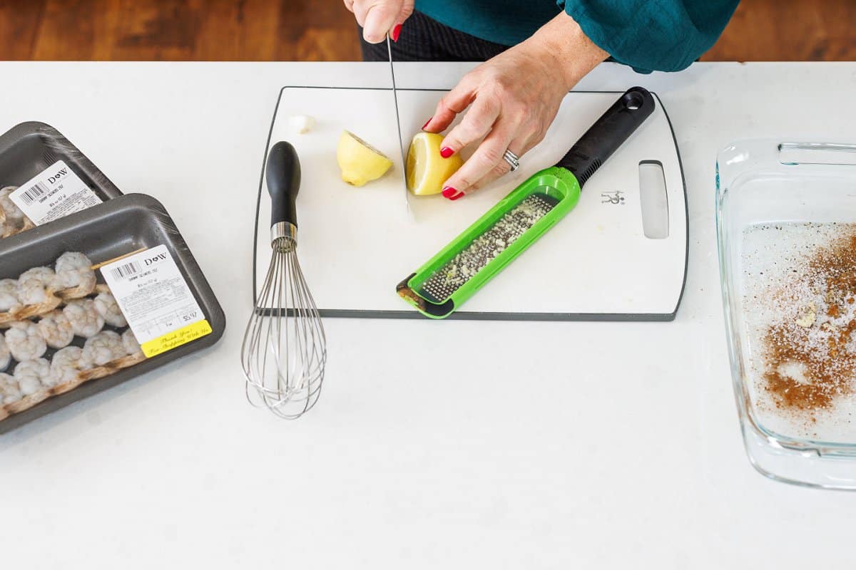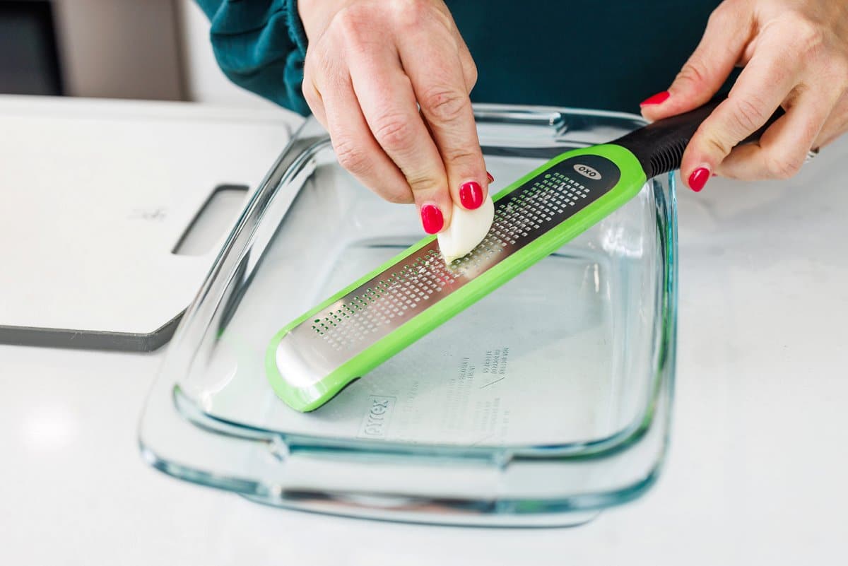 Get started on your Grilled Shrimp Shawarma Skewers by making the marinade. Take a baking dish or large bowl that’s long enough to fit your shrimp skewers and then grate in your garlic cloves with a microplane.