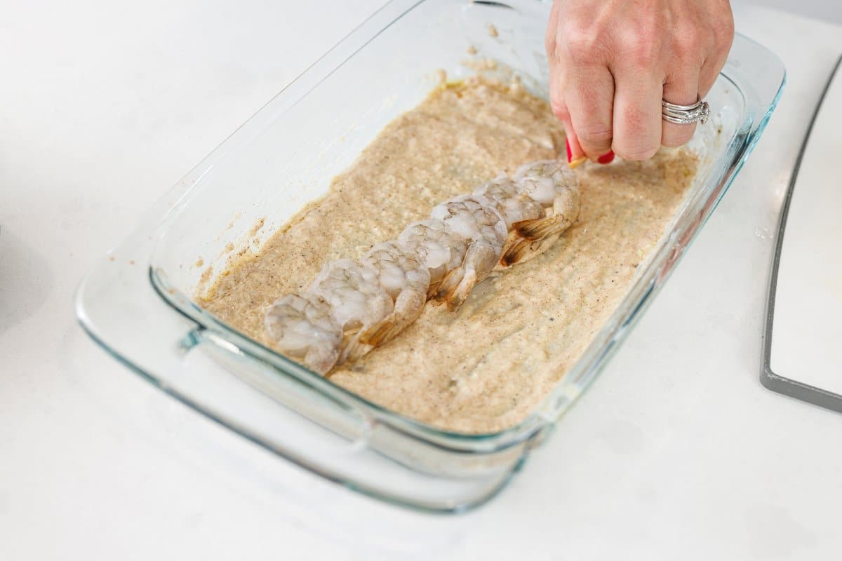 Then you’ll take your shrimp skewers and coat them in the shawarma marinade, flipping to cover each side.