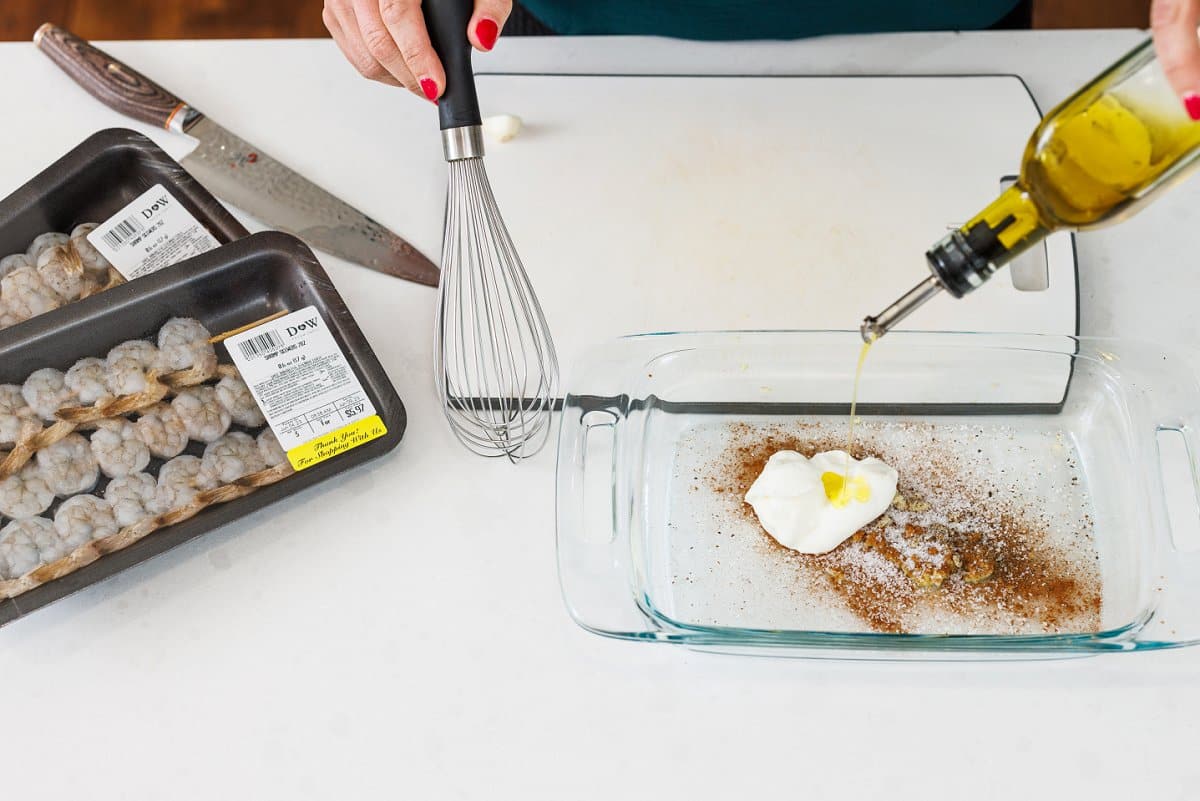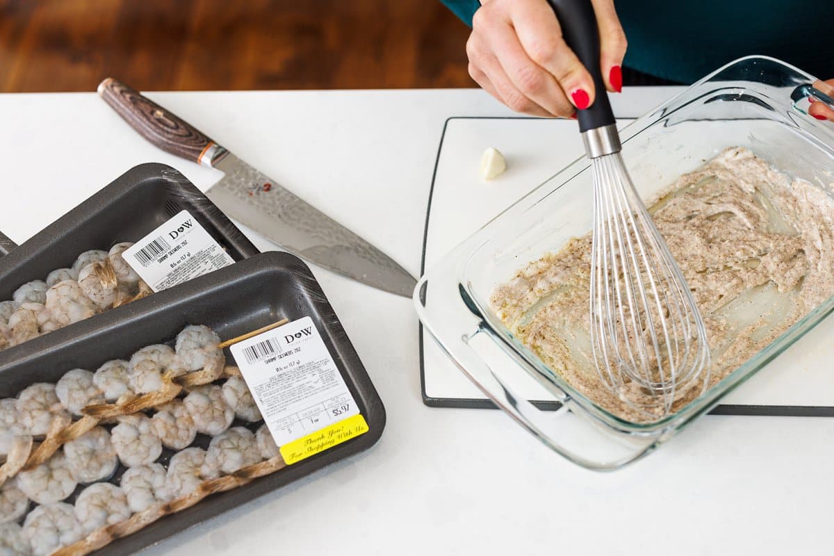 2. While grill is pre-heating, whisk together the marinade in the bottom of a large glass pan such as a brownie pan. Add the shrimp skewers and flip a few times to ensure evenly coated on both sides. Marinade for 10-15 minutes or so.