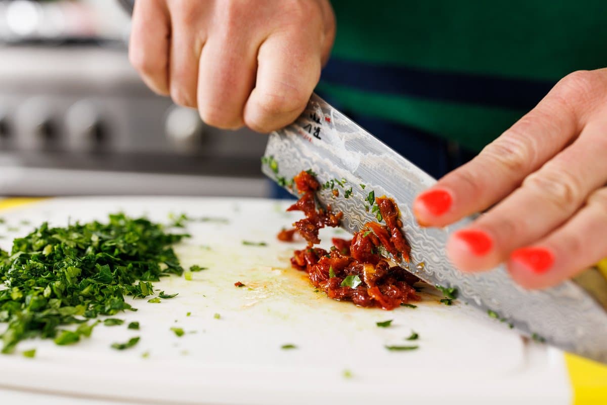 Start your Grilled Turkey Burgers with Pesto by mincing your sun-dried tomatoes.