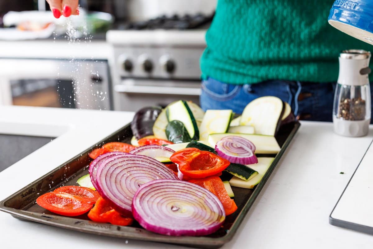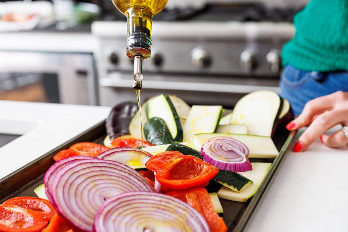 • Olive oil: Helps to coat the veggies in salt and pepper, as well as get an even cook on them.