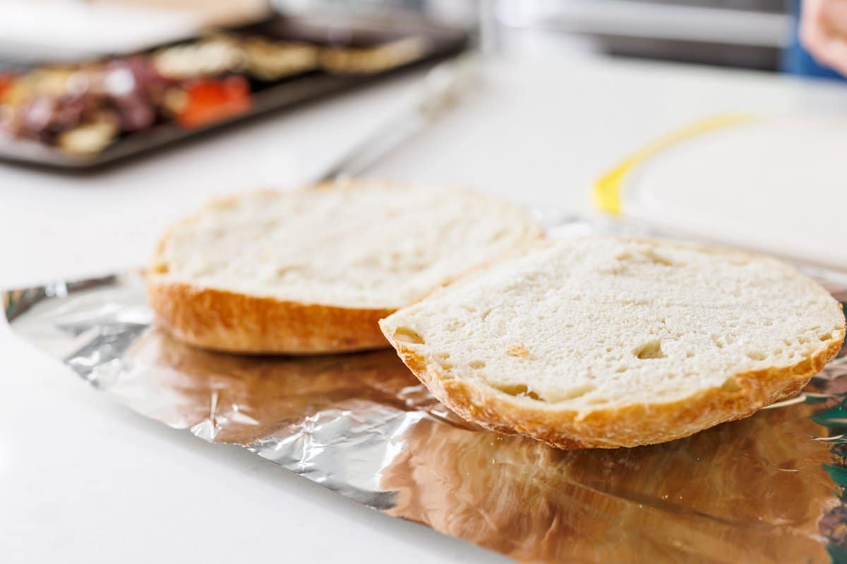 While veggies are grilling, you can prepare the rest of the sandwich by taking your bread and slicing it in half.