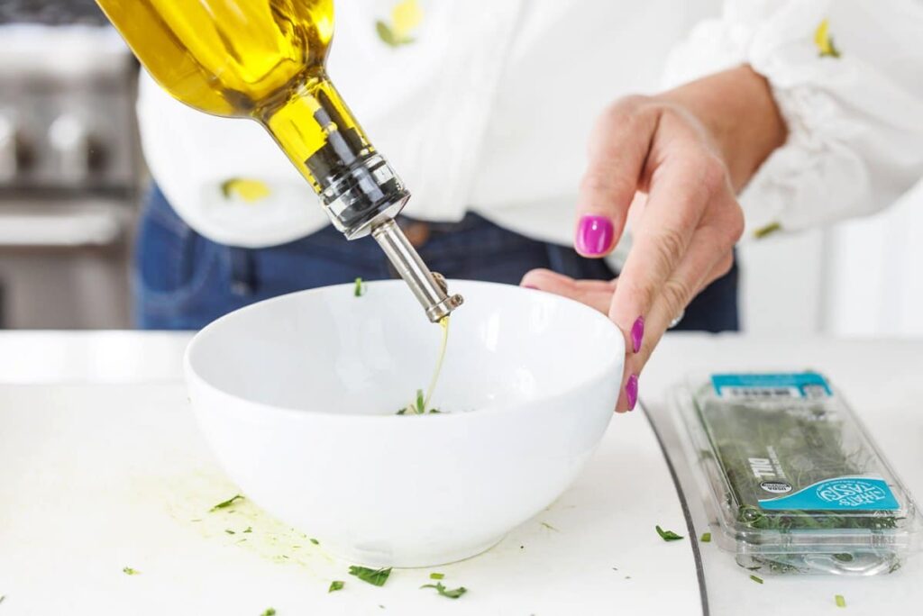 Step 4. Next you’ll make the lemon herb vinaigrette by mincing your fresh herbs and scallions. I used basil, dill, and parsley this time around.