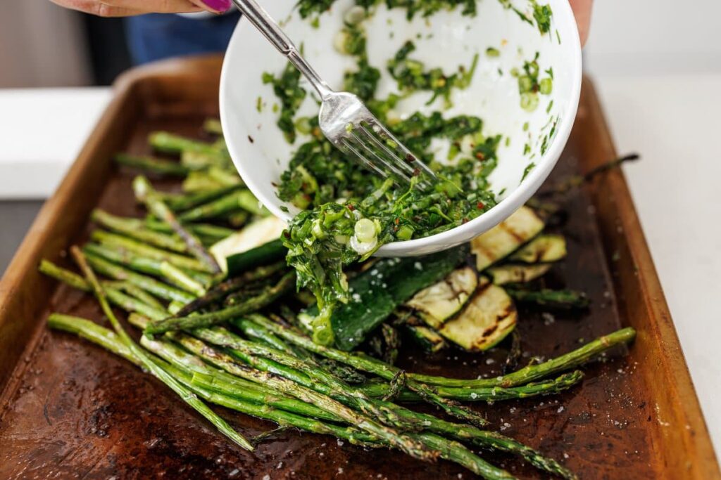 Step 8. Then take your lemon herb vinaigrette and pour it over the grilled asparagus and zucchini.