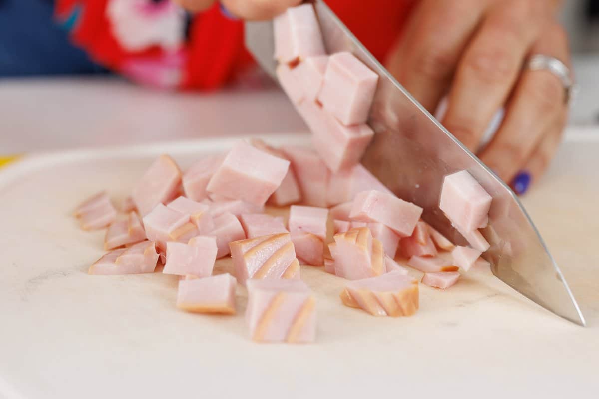 Then cut your ham into small, bite-sized pieces, and mince your scallions.