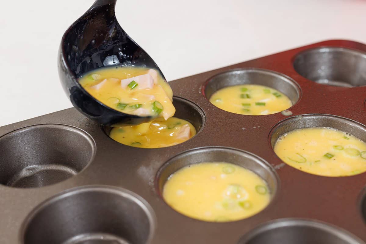 Then using a ladle or measuring cup, evenly distribute the egg mixture into your muffin tin.