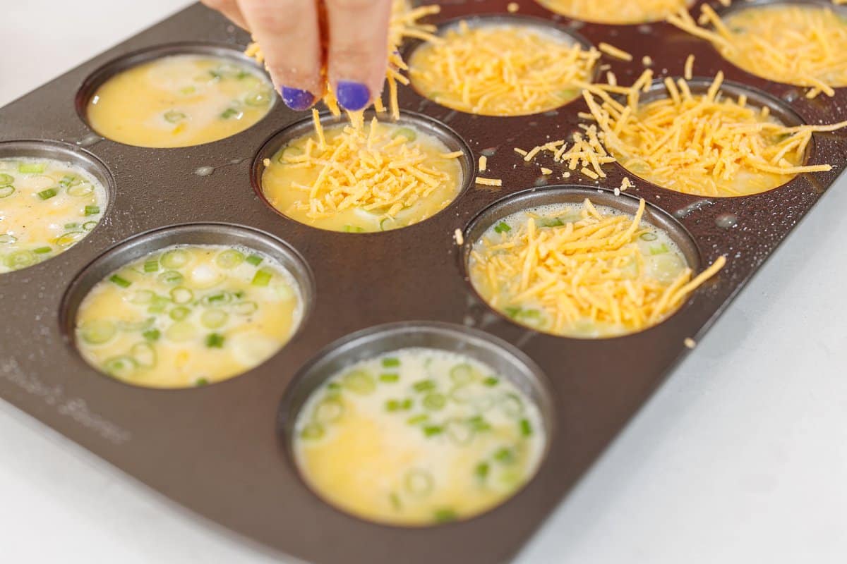 - Divide egg mixture evenly between 12 muffin tins (about 1/3 cup each) then sprinkle evenly with sharp cheddar.