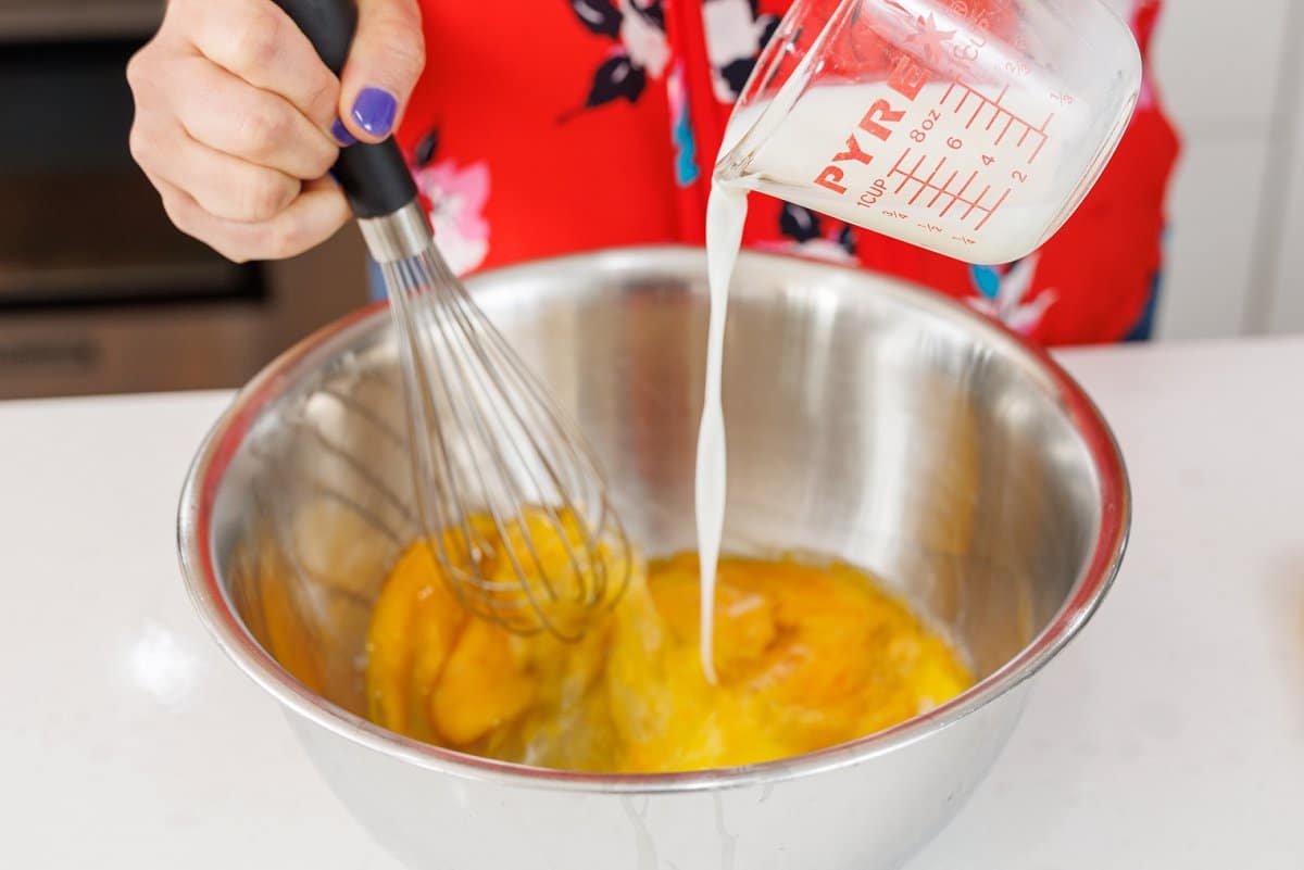 Beat your eggs with a whisk, and slowly stir in your milk. Season with a pinch of salt and pepper.