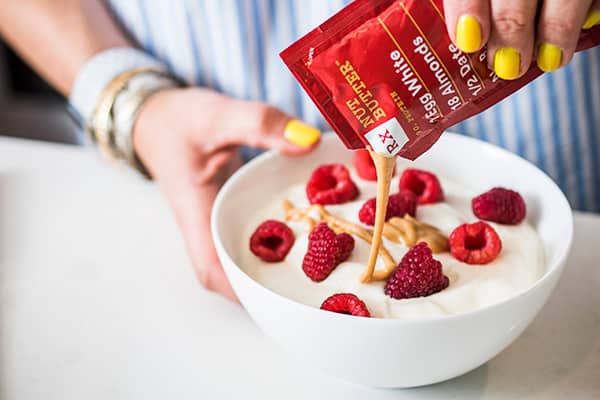 Speaking of breakfast, why should maple syrup have all the fun on your morning stack of pancakes? I love maple syrup as much as the next gal but it’s nothing but empty calories. The runny consistency of RX Nut Butter is ideal for pouring over pancakes and it’s a great way to boost the nutrition of your short stack.