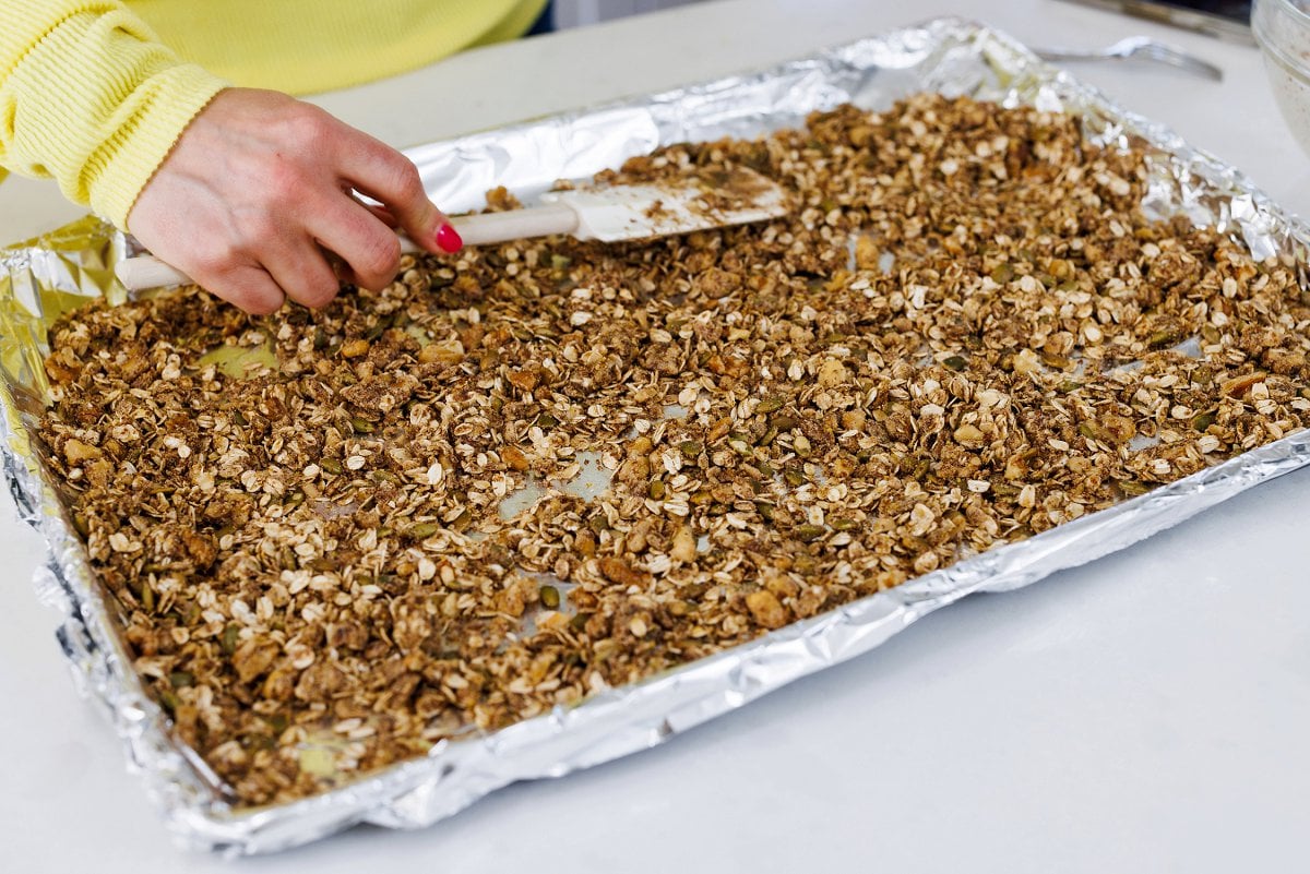 Spread the granola evenly over a prepared baking sheet, then pop in the oven at 325 for 25-30 minutes.