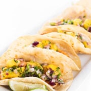 These fresh and flavorful baked fish tacos with mango salsa are made with broiled tilapia and topped with a sweet and spicy mango salsa.
