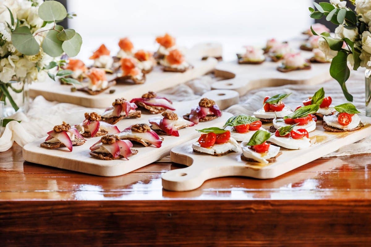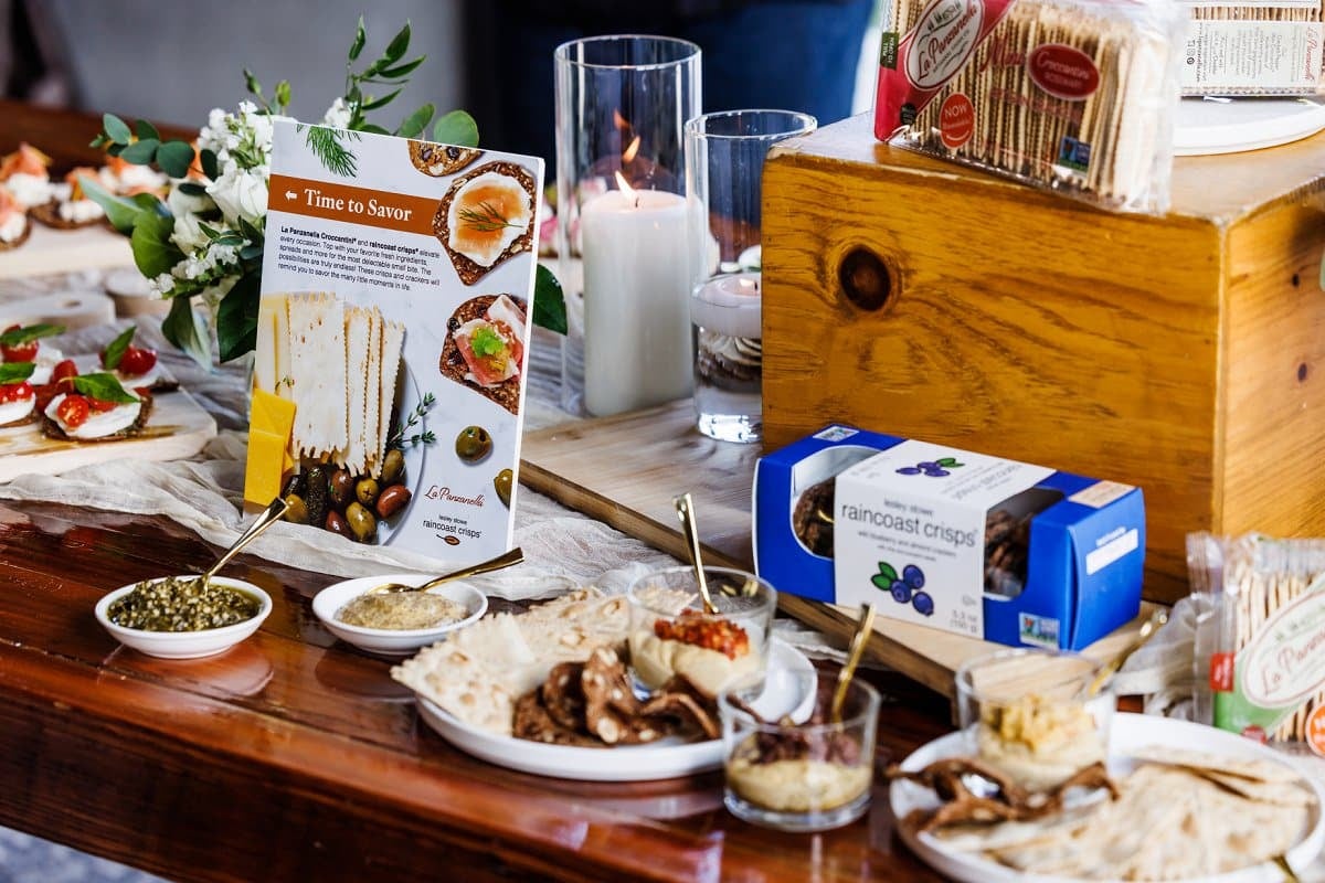 Once you’ve decorated and the food is prepared, just wait for your guests to arrive and enjoy the party! We included some pre-made bites using raincoast crisps with burrata cheese, cherry tomatoes, and basil for a caprese salad feel, as well as cream cheese, poached pear, and candied walnuts. Having the food all be bite-sized makes it easy to eat and enjoy while talking or moving around the party!