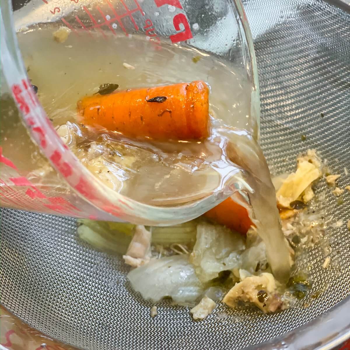 When it’s time to strain the chicken stock from the vegetables and bones, place a fine-mesh strainer over a large liquid measuring bowl.