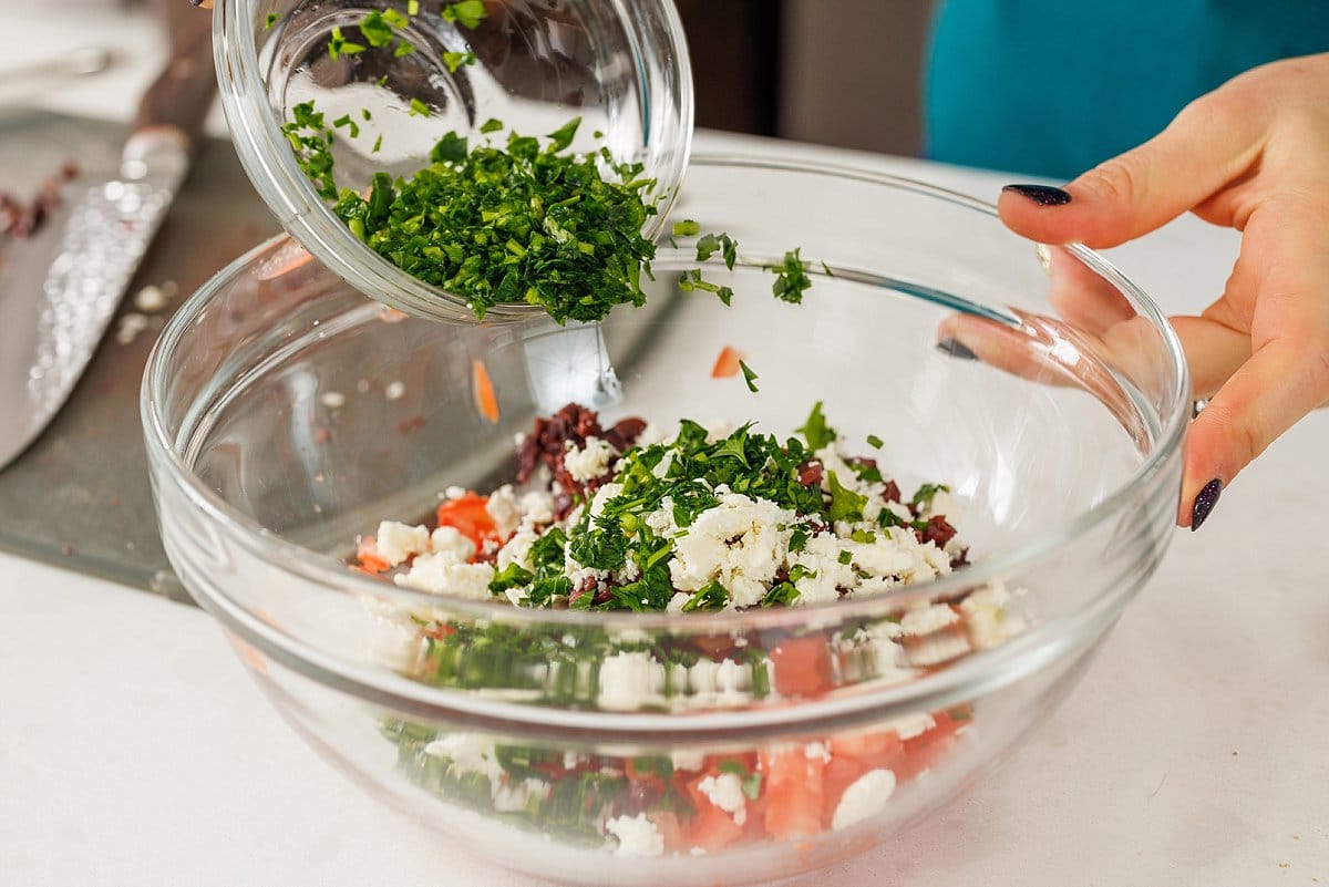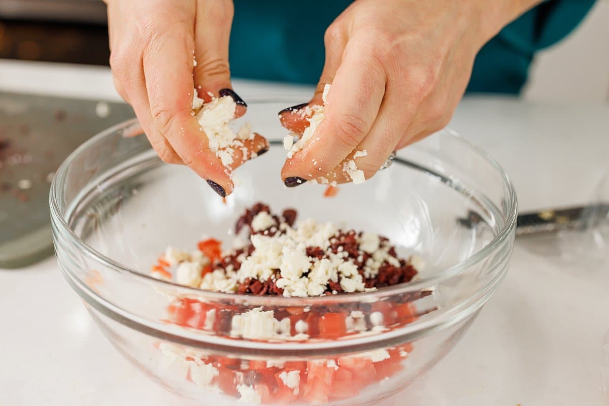 Add and crumble the feta cheese into the bowl.