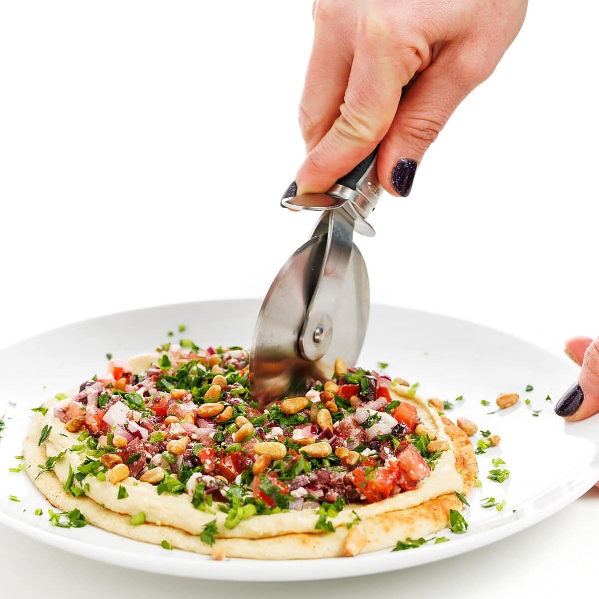 Use a pizza cutter to cut into slices, serve, and enjoy your Hummus Pizza with Greek Tapenade.