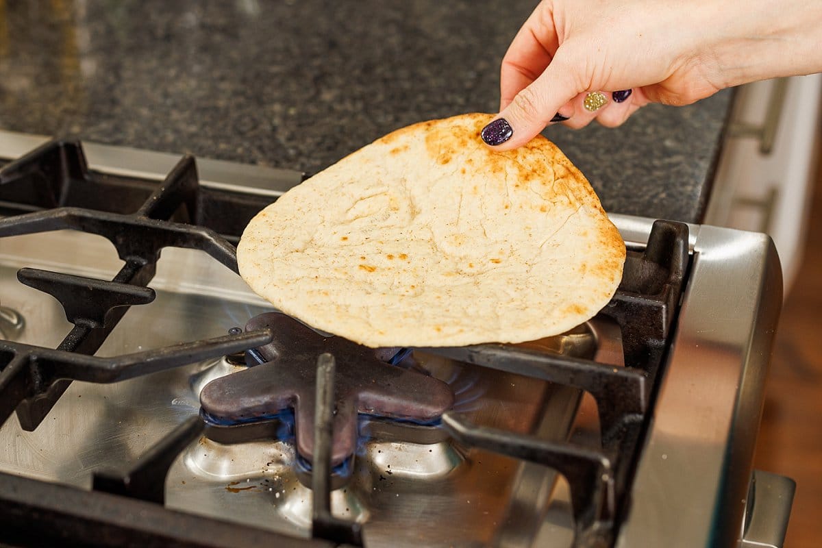 Next, heat your pita over the open flame of your stove (or in a pan if that’s more your style).