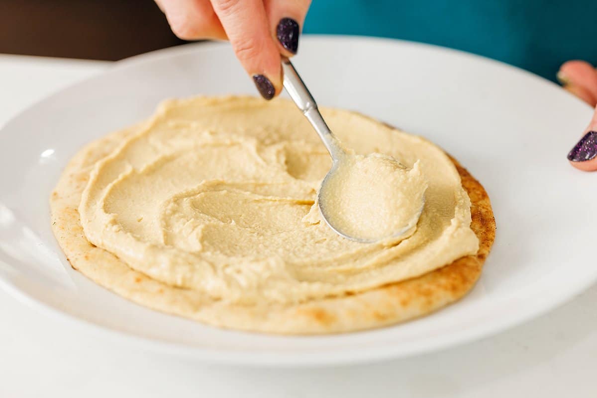 1. Place pita on a large plate or platter and spread evenly with hummus.