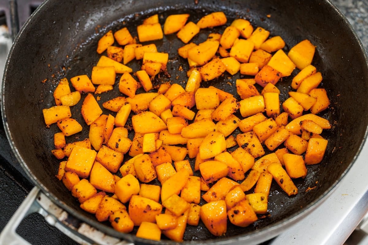 - Add the butternut squash cubes to the hot pan and sauté in the remaining fat rendered from the sausage.