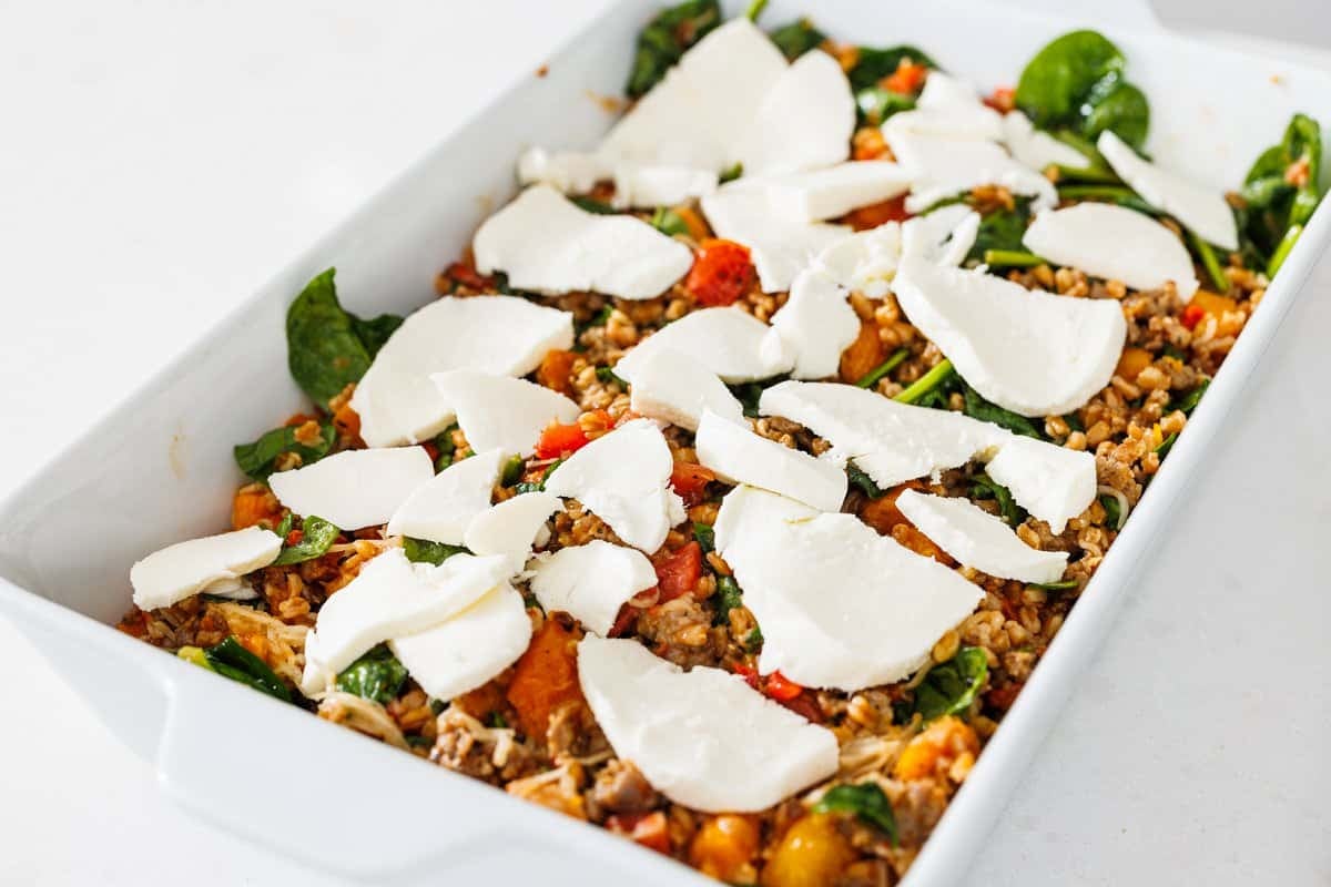 This Italian Sausage and Butternut Squash Farro Bake is hearty and comforting, made with nutty farro, spicy sausage, creamy butternut squash, and two types of mozzarella cheese.